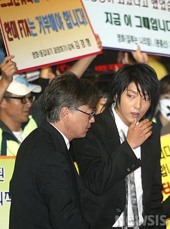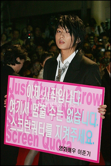 演員李準基於12日下午 6點左右在第11屆釜山國際電影節開幕式舉辦地點-釜山帆船競技場露天放映場面前,手拿告示牌並發起「促進Screen Quota恢復原狀」的沉默示威。